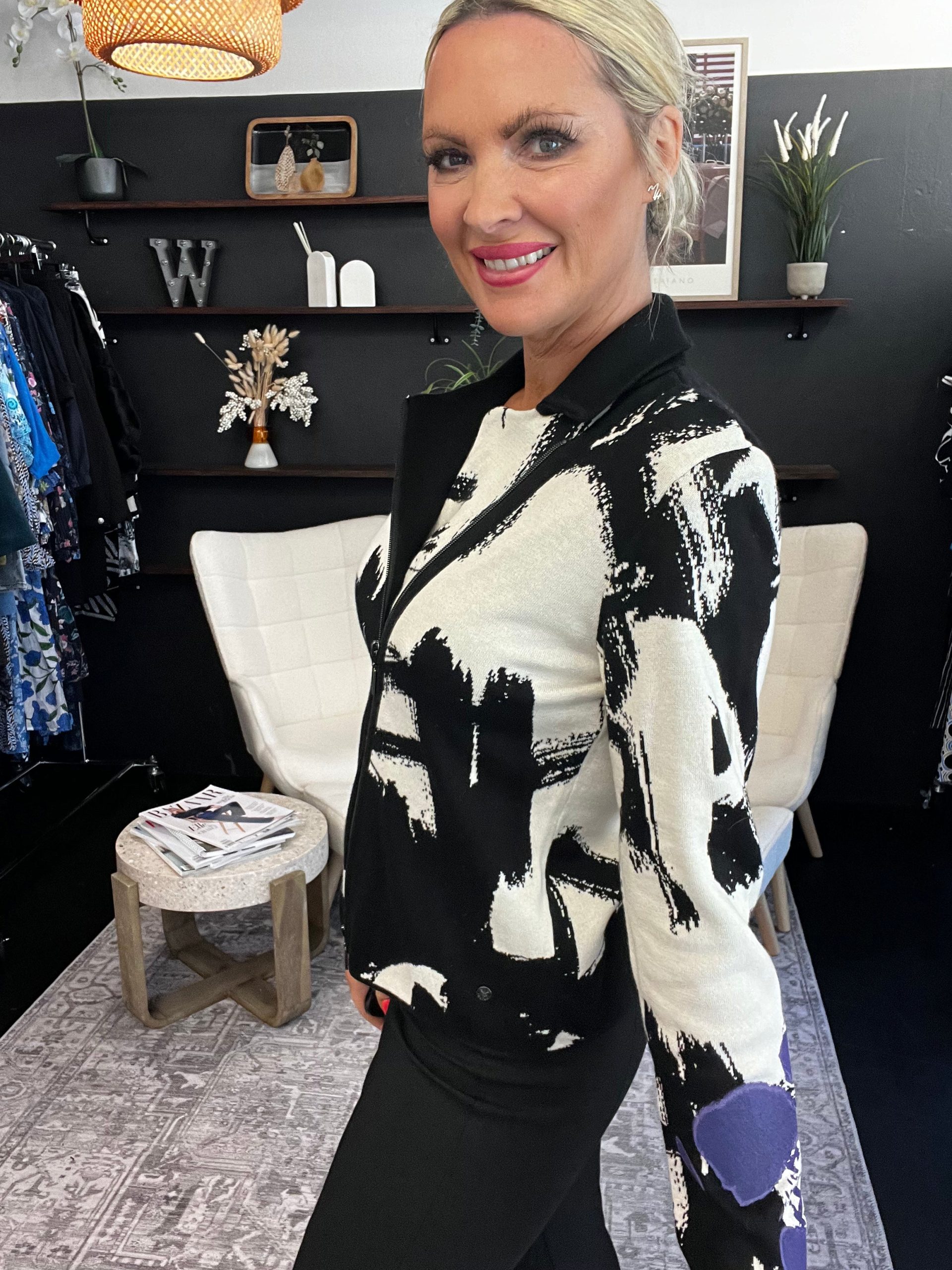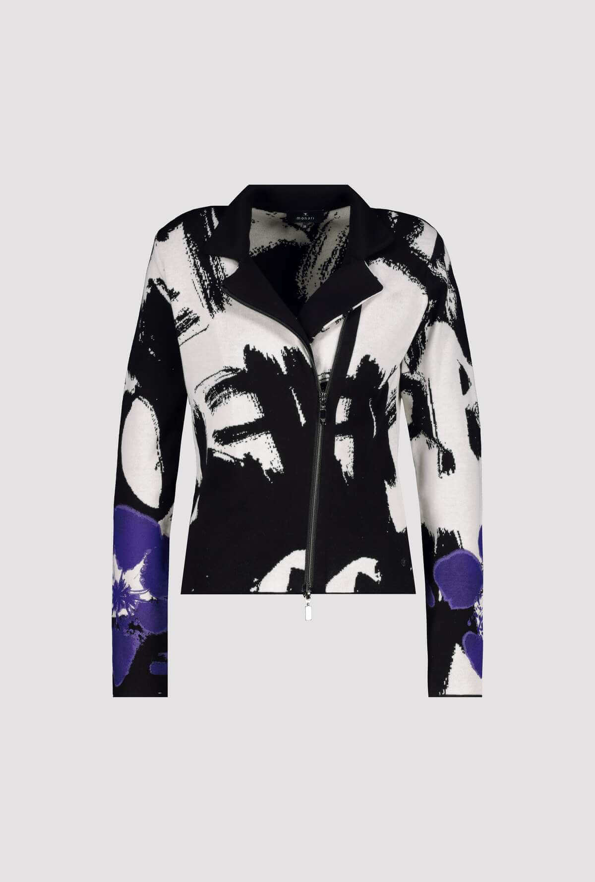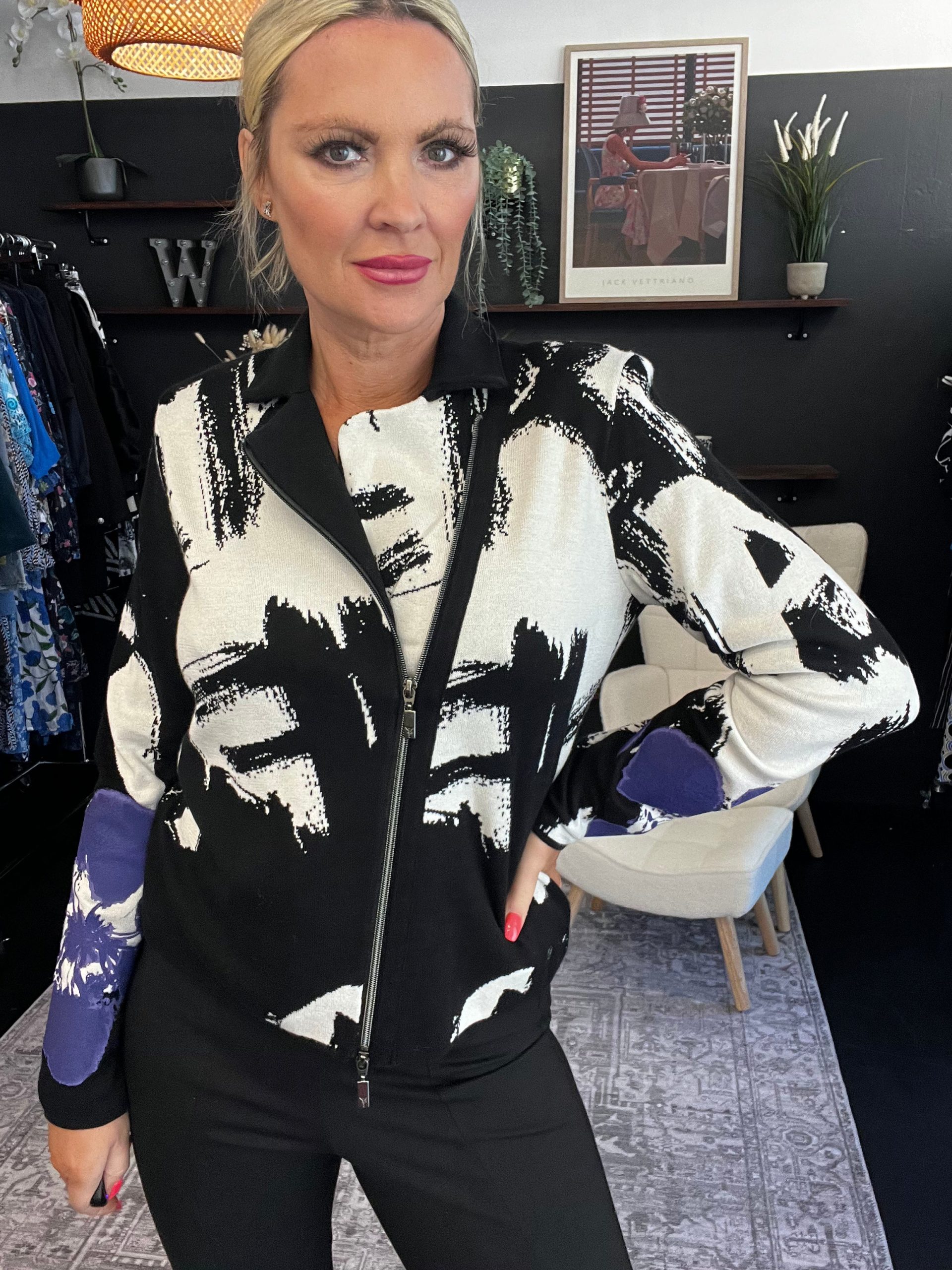 The black and white abstract brushstroke design, accented with vibrant purple floral details on the sleeves, adds a bold and unique aesthetic. The zip-up front closure provides functionality and a versatile style, allowing you to wear it as a standalone top or a layering piece. The ribbed cuffs and hem offer a snug fit, enhancing the silhouette.