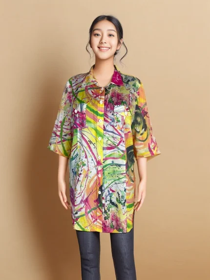 This elegant and artistic knitwear combines modern style with unmatched comfort. Crafted from a premium blend of 70% fine cotton and 30% breathable polyester, this piece ensures durability and a soft touch against the skin. The fabric is lightweight yet warm, making it perfect for layering during transitional seasons.