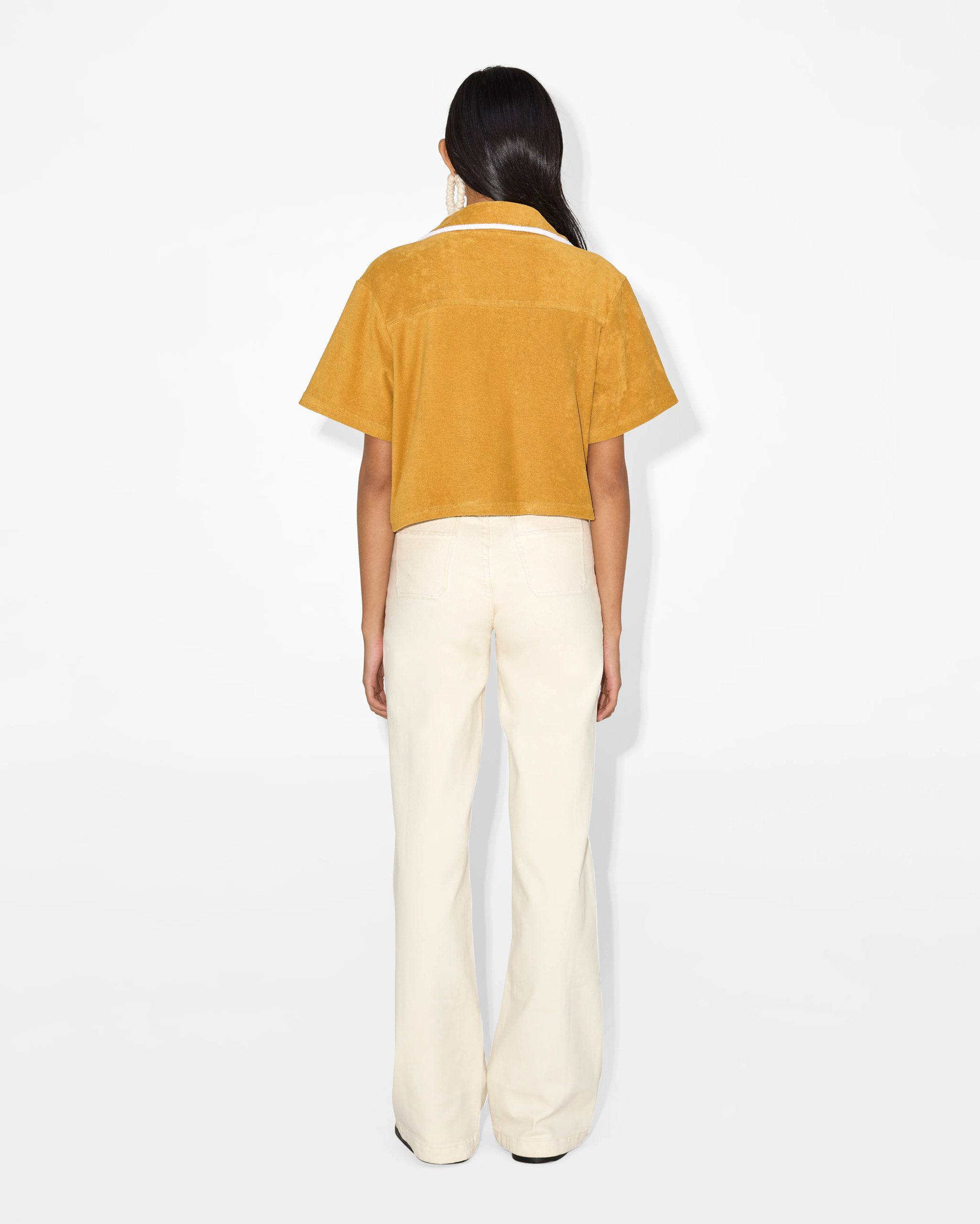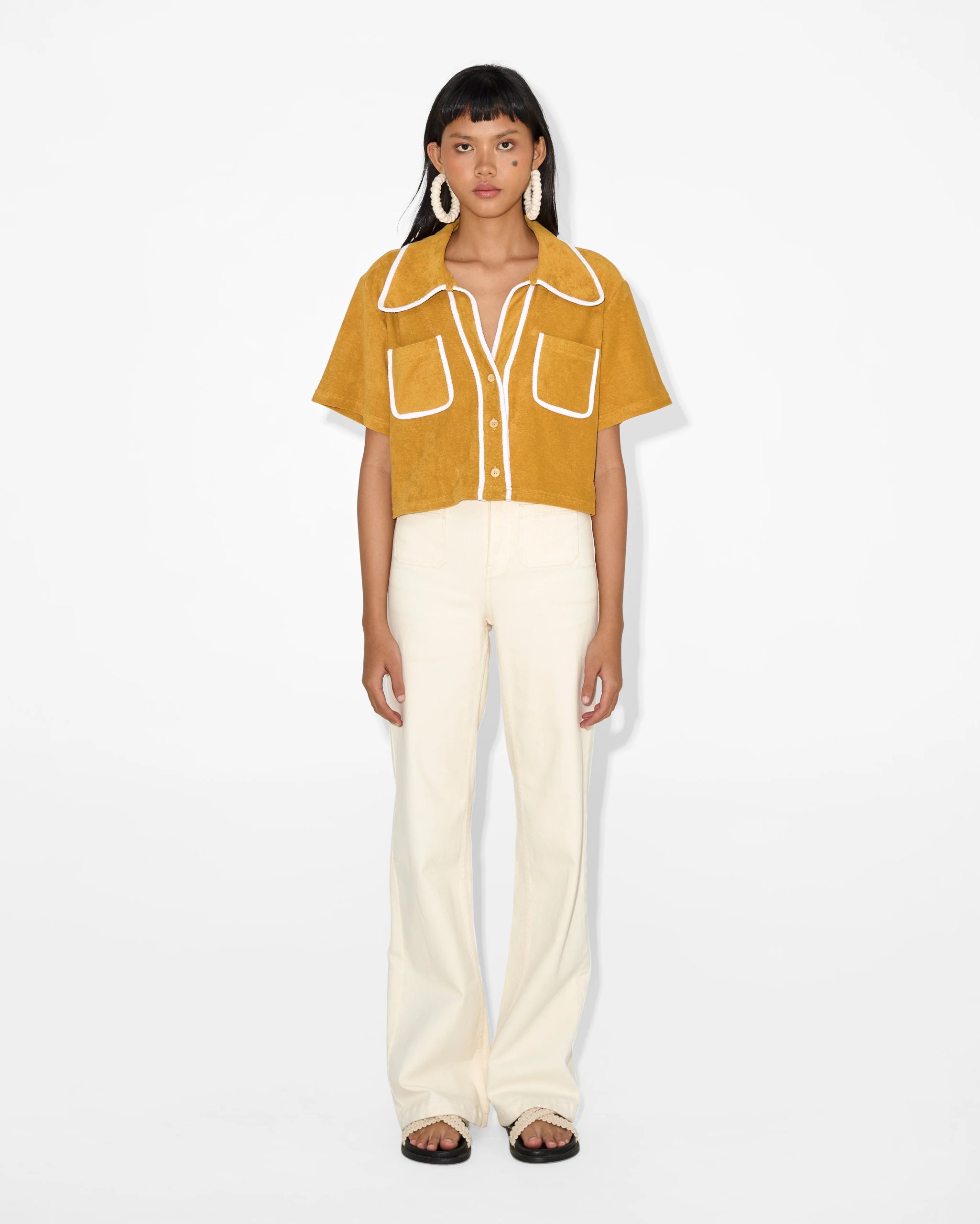 This stylish button-down shirt comes in a warm mustard color, perfect for creating a relaxed yet polished look. The fabric is soft to the touch and comfortable for everyday wear, crafted from a lightweight cotton blend that ensures breathability and durability. The white piping around the edges adds a retro vibe to the modern design, offering a refreshing pop of contrast.