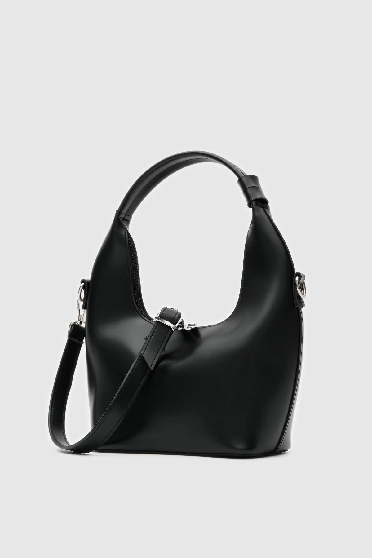 This sophisticated black hobo bag is a perfect blend of elegance and functionality. Crafted from durable yet affordable synthetic leather, it offers a sleek and timeless appeal that seamlessly complements any wardrobe.