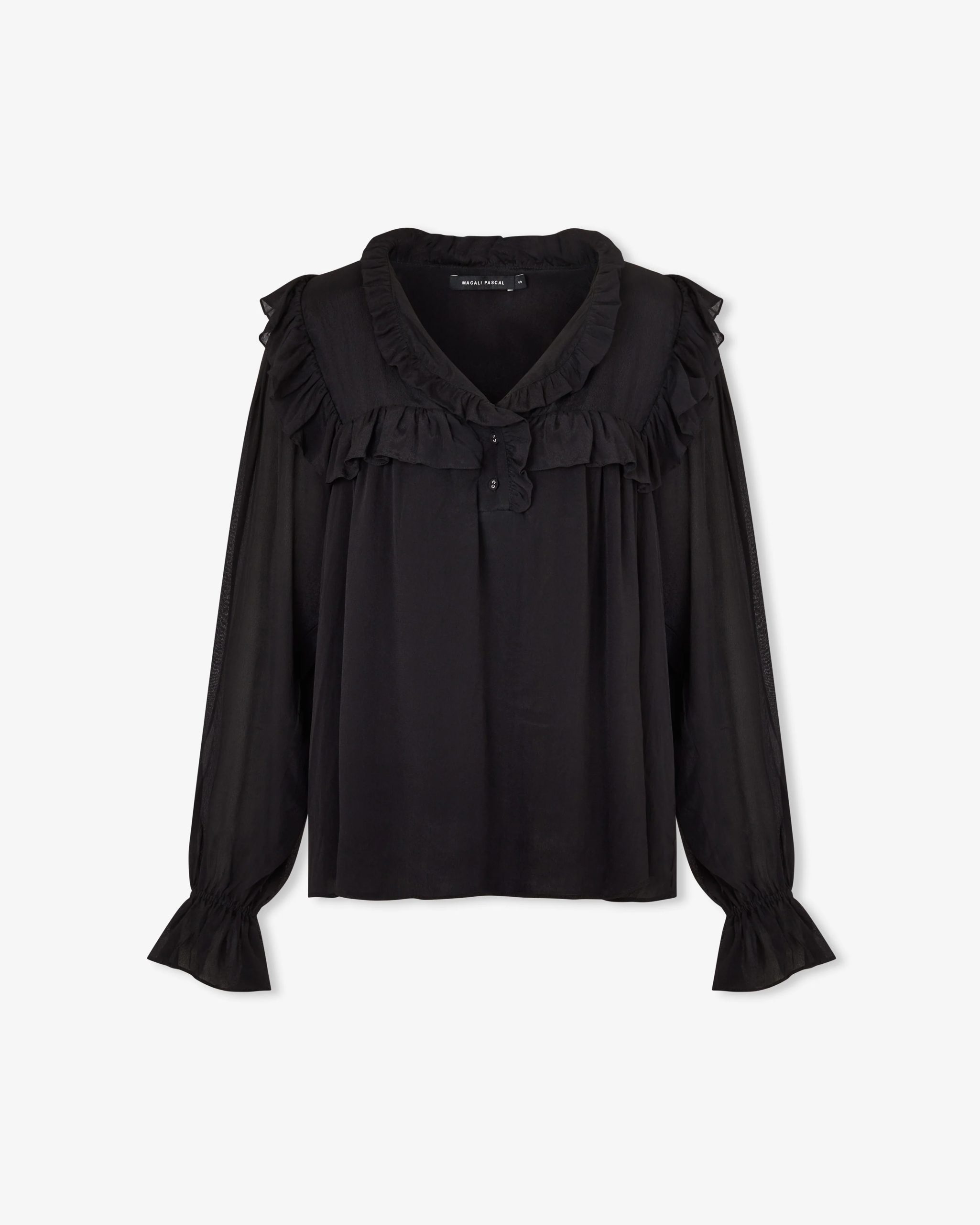 This sophisticated black blouse is crafted from a lightweight, breathable chiffon fabric that combines comfort with style. The design features delicate ruffled detailing along the collar and chest, adding a feminine touch to its timeless silhouette. The soft fabric provides a gentle drape, ensuring a flattering fit for all body types.