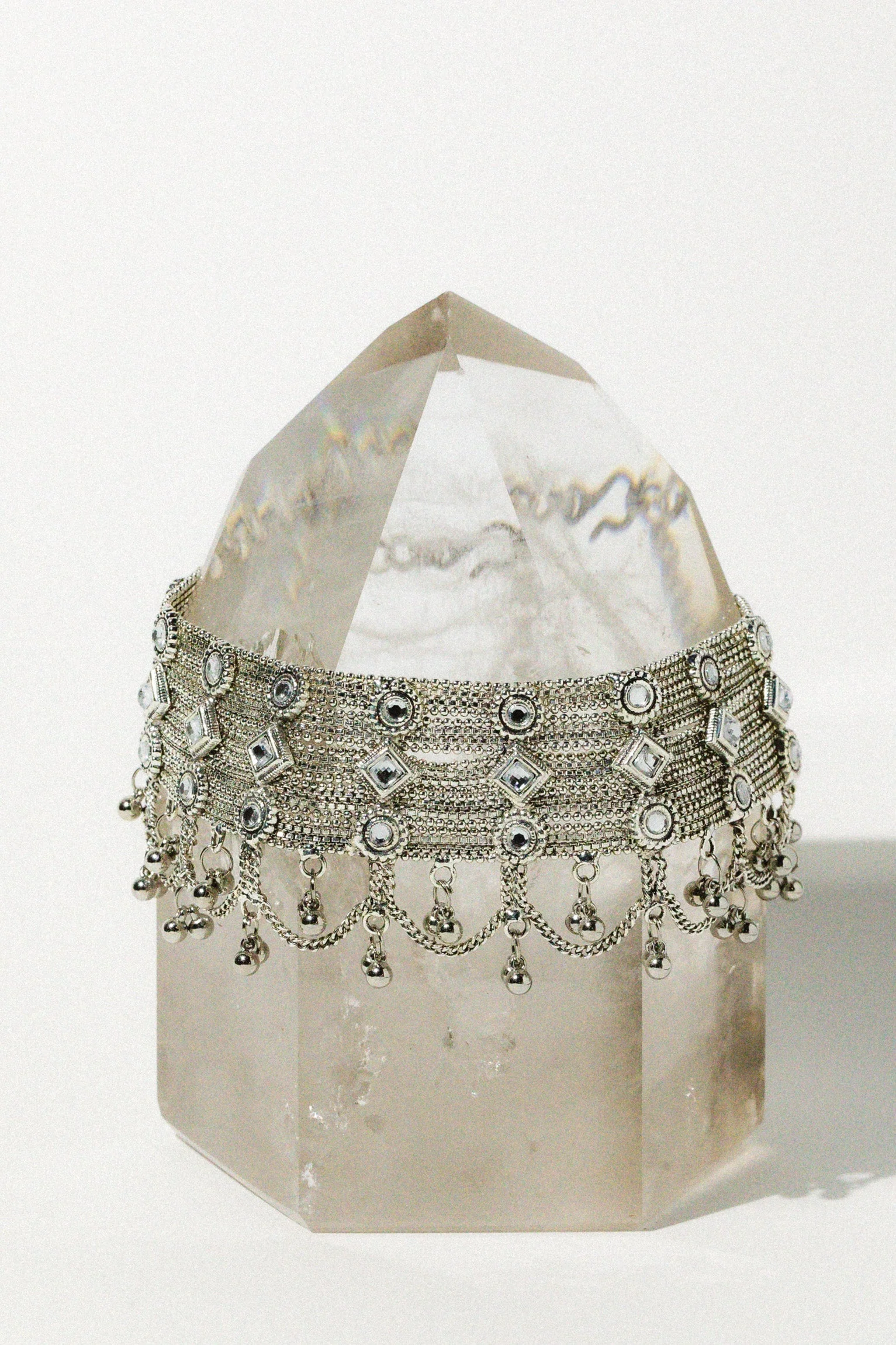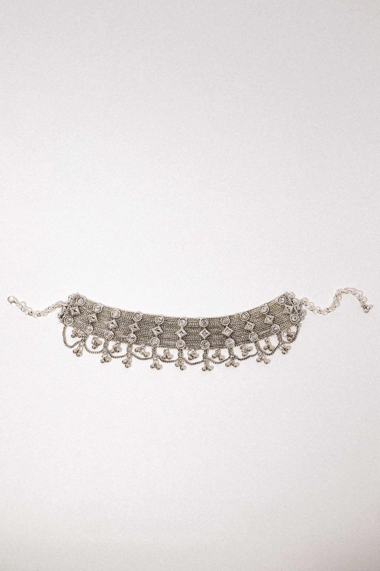 This exquisite necklace is designed to captivate with its sophisticated charm and intricate detailing. Crafted from high-quality stainless steel, this piece embodies a blend of elegance and durability. The necklace boasts a beautiful array of clear glass crystals, each meticulously arranged to enhance its sparkling allure. Its ornate chain features delicate dangles that sway gracefully, capturing the light to add a touch of magic to your attire.