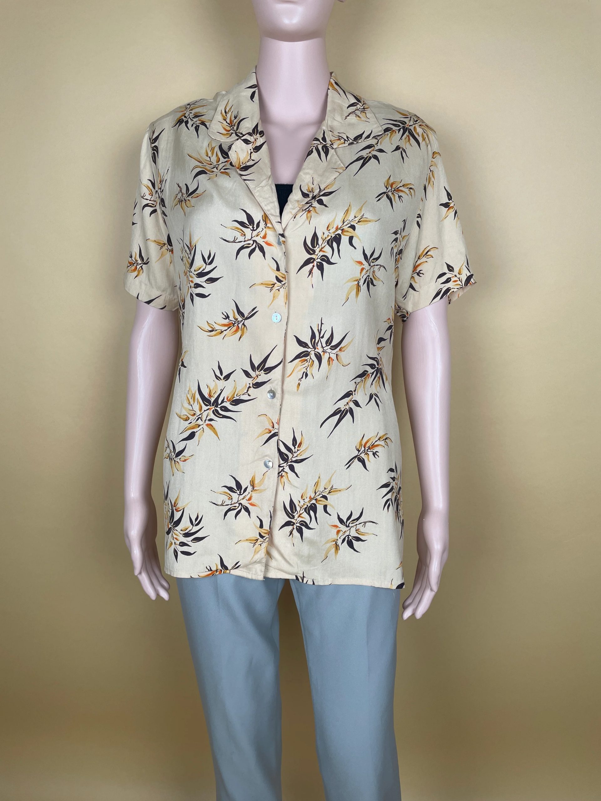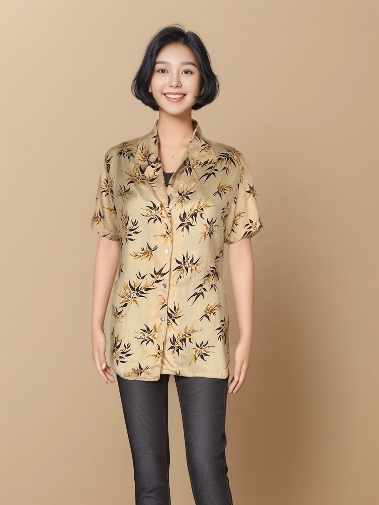 The shirt features an exquisite floral pattern in earthy tones, adding a touch of nature-inspired elegance to your wardrobe. The short sleeves and classic collar design ensure comfort and versatility, allowing you to style it effortlessly with different types of bottoms.