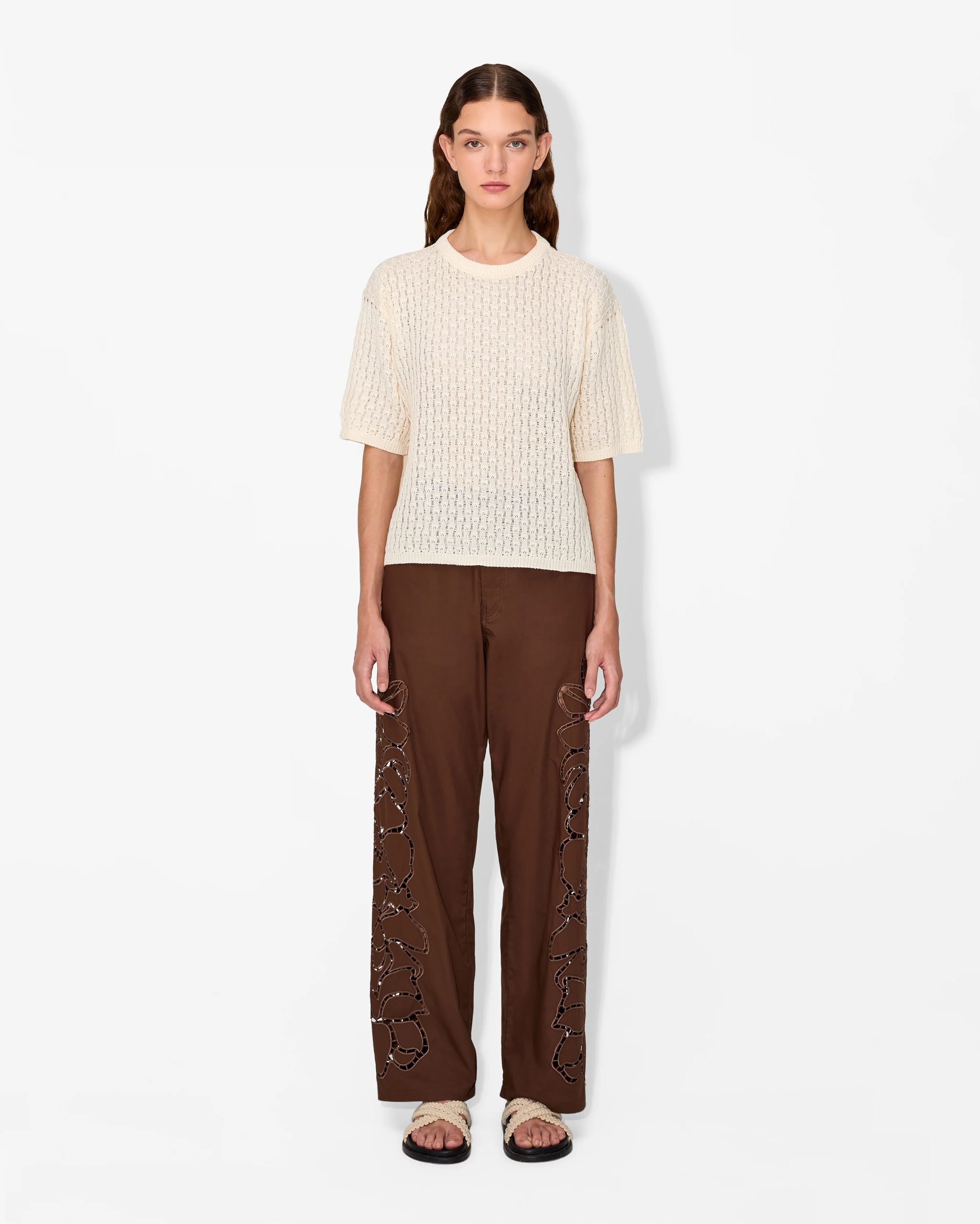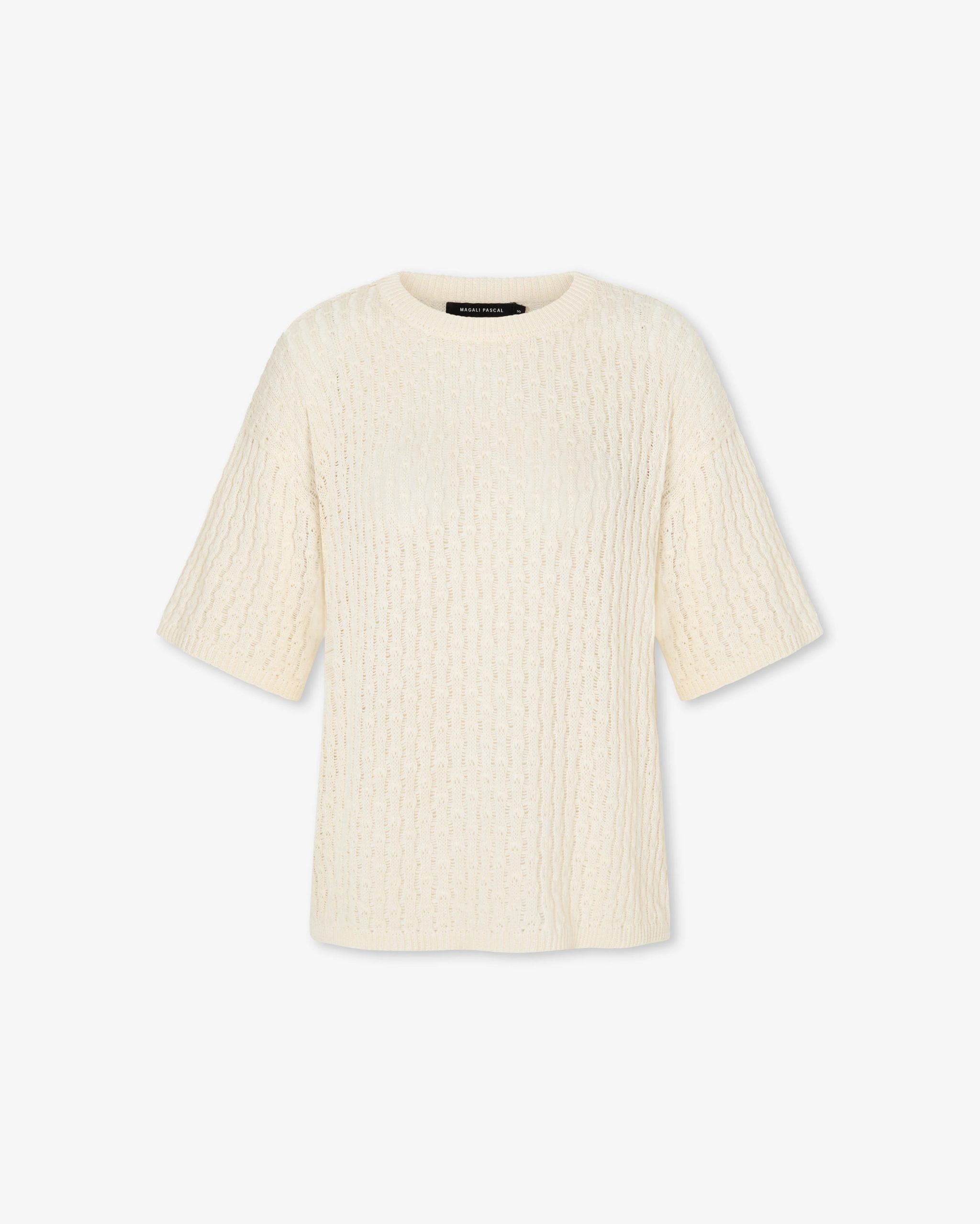 This sophisticated short-sleeve sweater is crafted from a lightweight and breathable open-knit fabric,