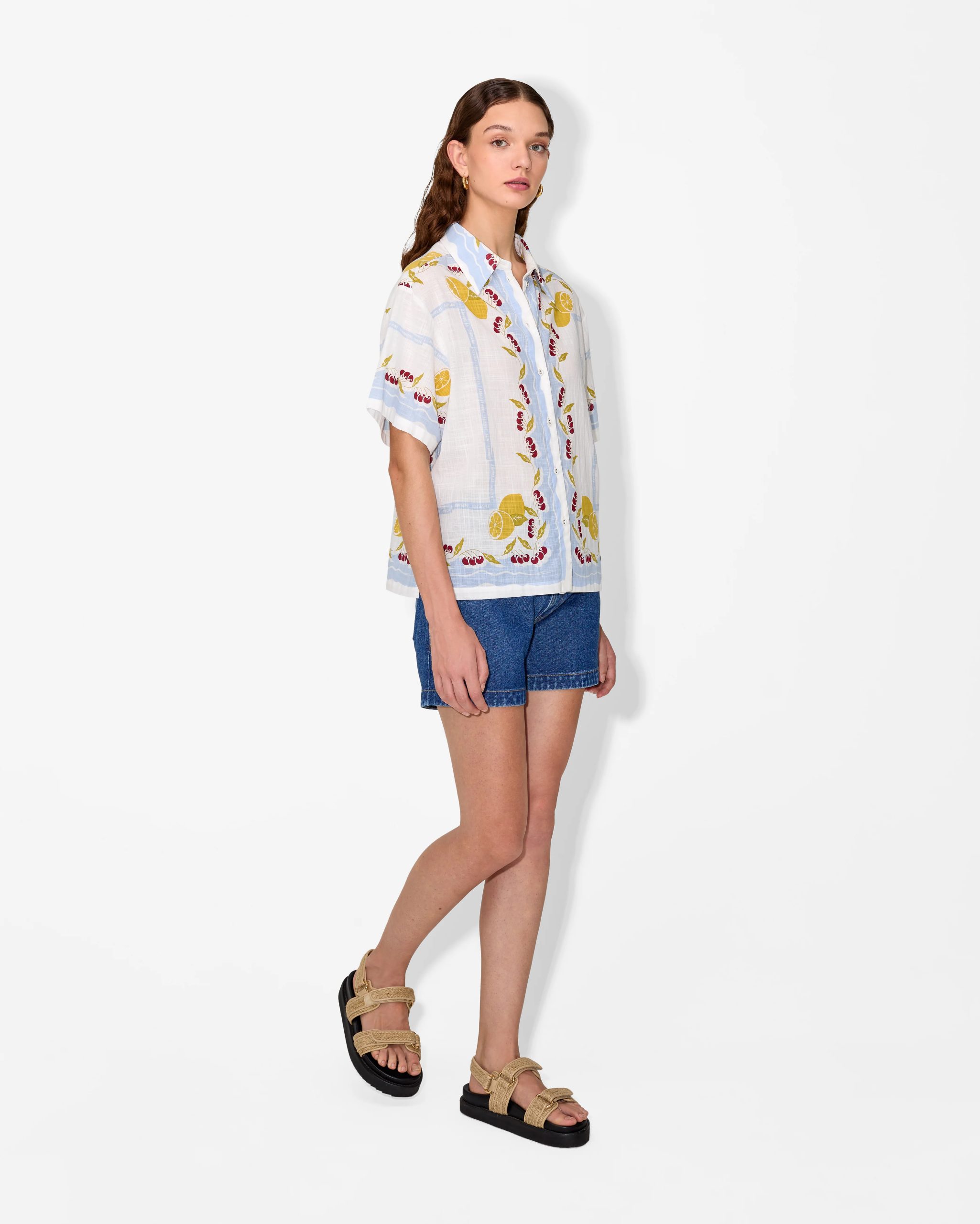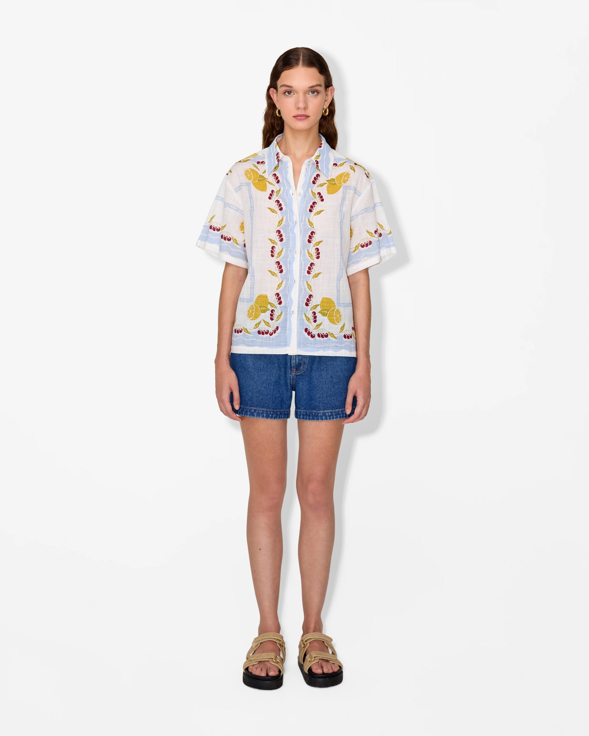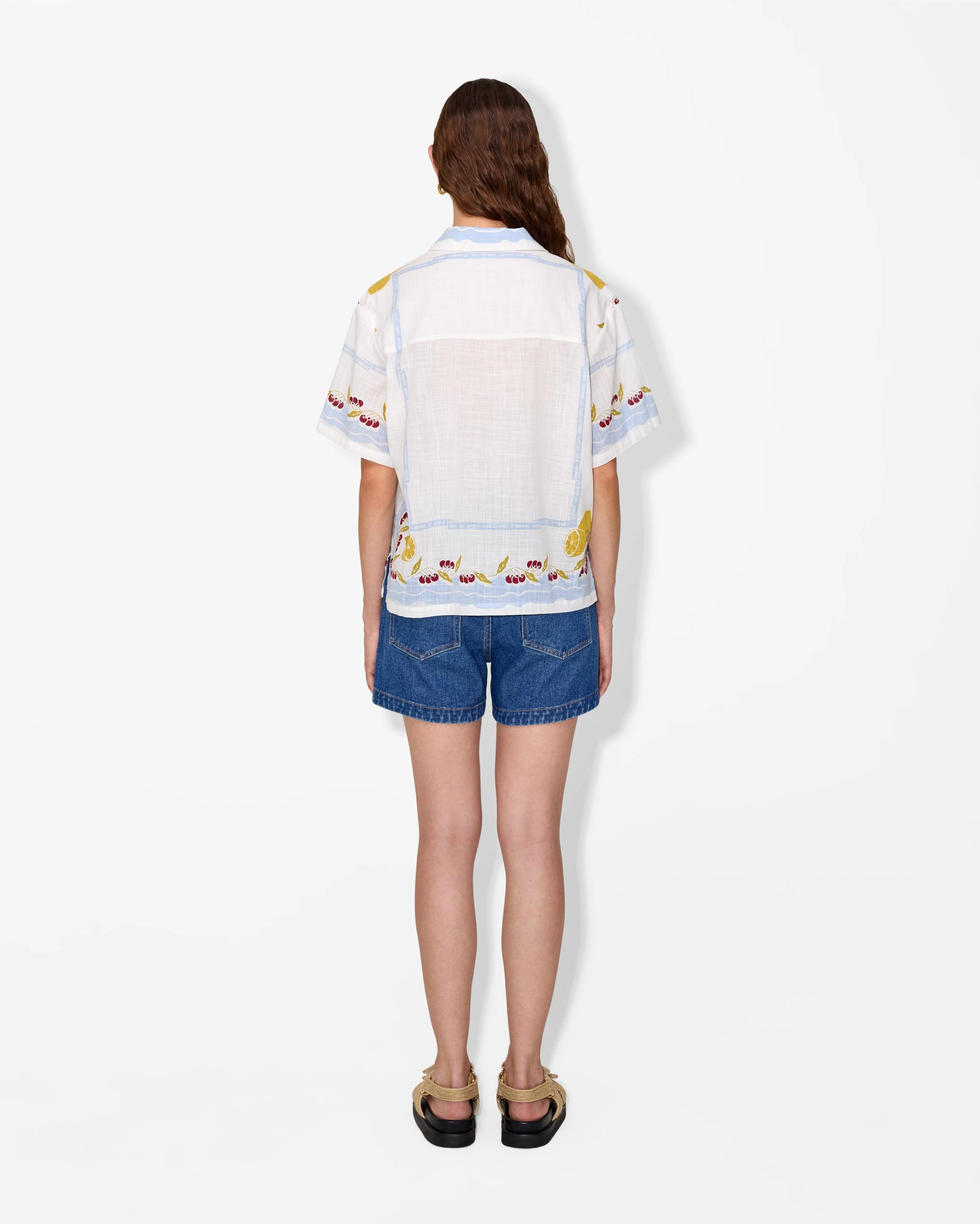 This exquisite blouse is crafted from a luxurious blend of linen and cotton, offering a lightweight and breathable fabric that is perfect for warm weather. The delicate embroidery features vibrant yellow floral and cherry motifs, adding a touch of artisanal charm to the design. With its relaxed fit and button-up front, this blouse seamlessly blends elegance and comfort.
