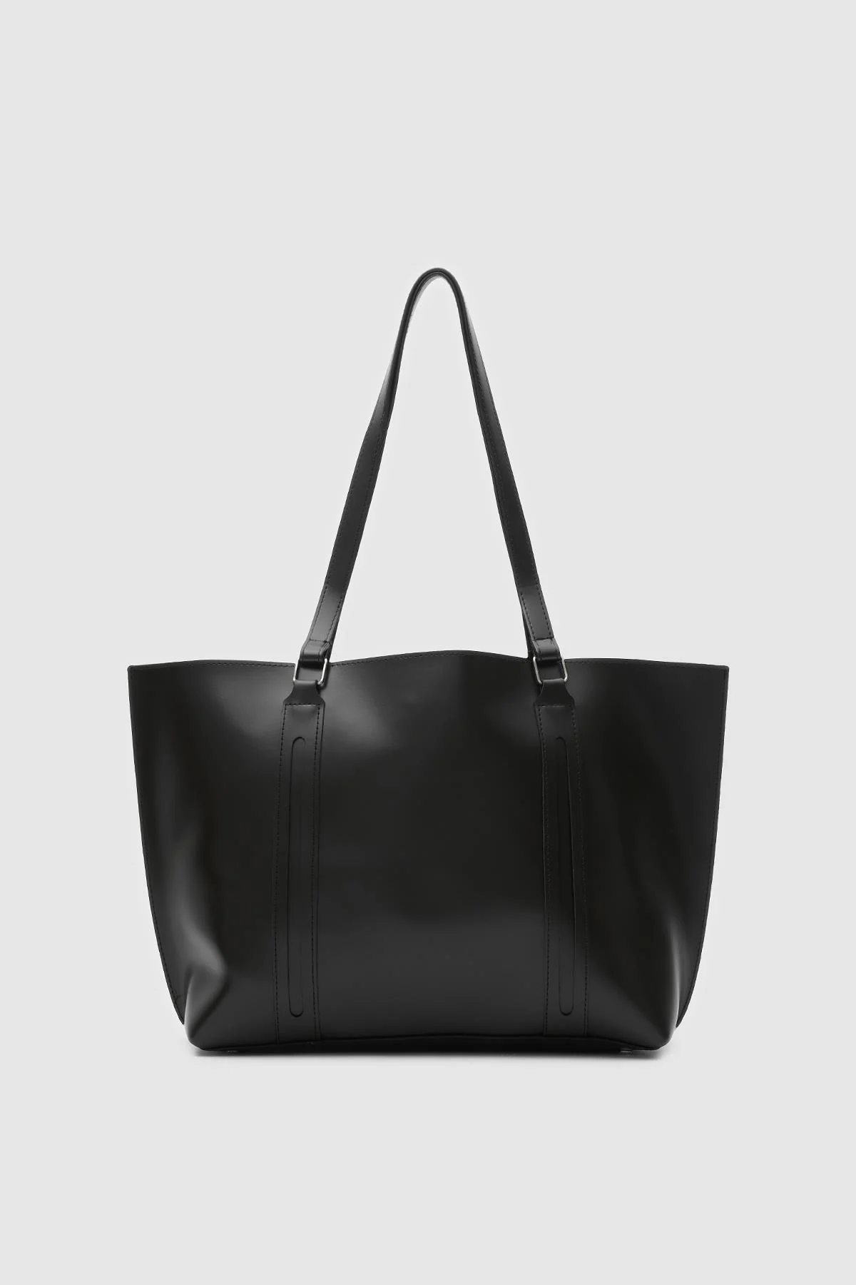 This elegant black tote bag is crafted from high-quality faux leather, offering a luxurious look and feel while remaining economically friendly. Its sleek design is perfect for both formal and casual settings, making it a versatile addition to any wardrobe.