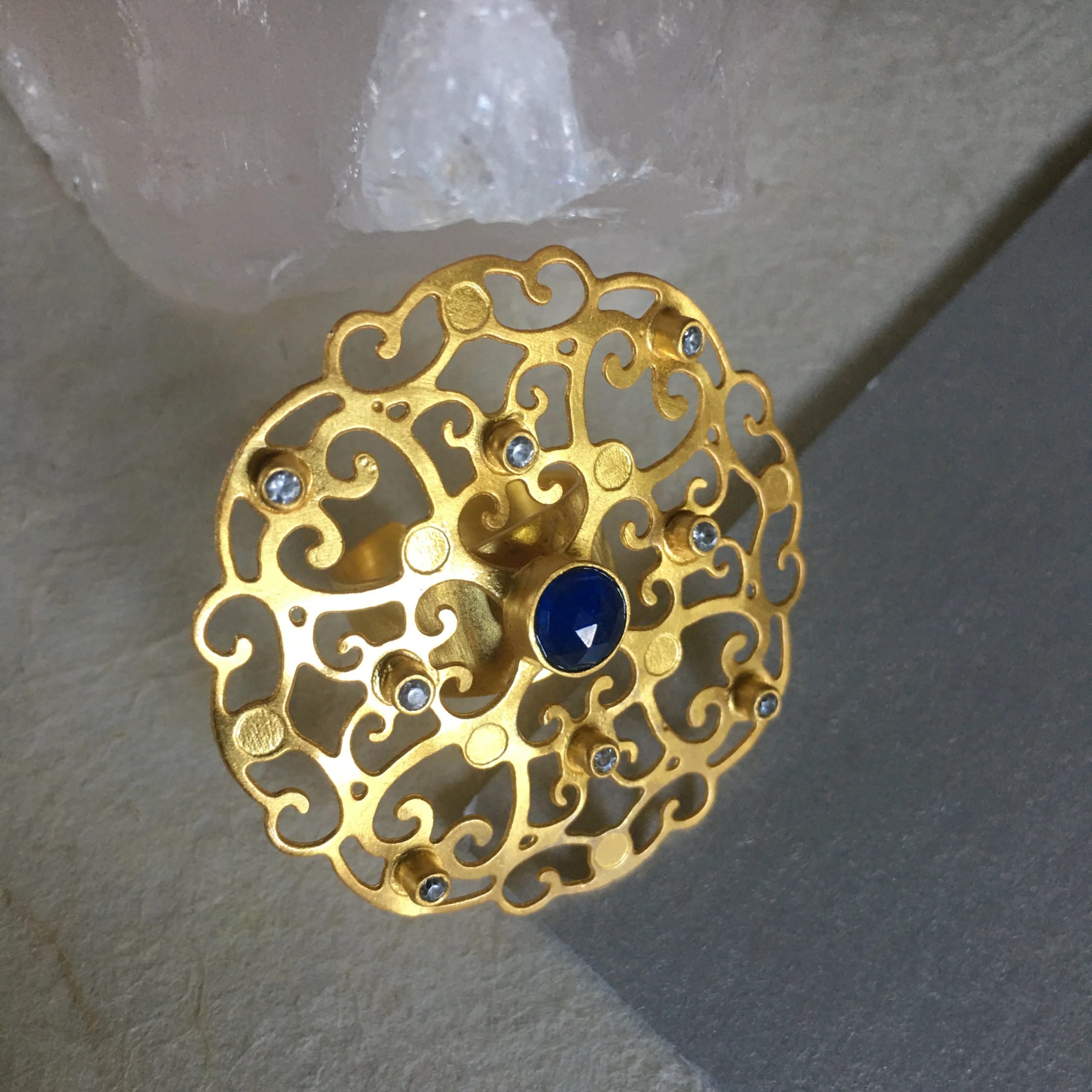 This stunning ring is crafted from premium quality brass, highlighted with a vibrant golden hue that perfectly captures light and attention. Adorned with intricate filigree patterns, this ring exudes a vintage charm combined with a modern touch. The centerpiece is a captivating midnight blue acrylic gemstone, offering a striking contrast to the warm brass tones, while the surrounding small crystals bring a sparkling finish to the design.