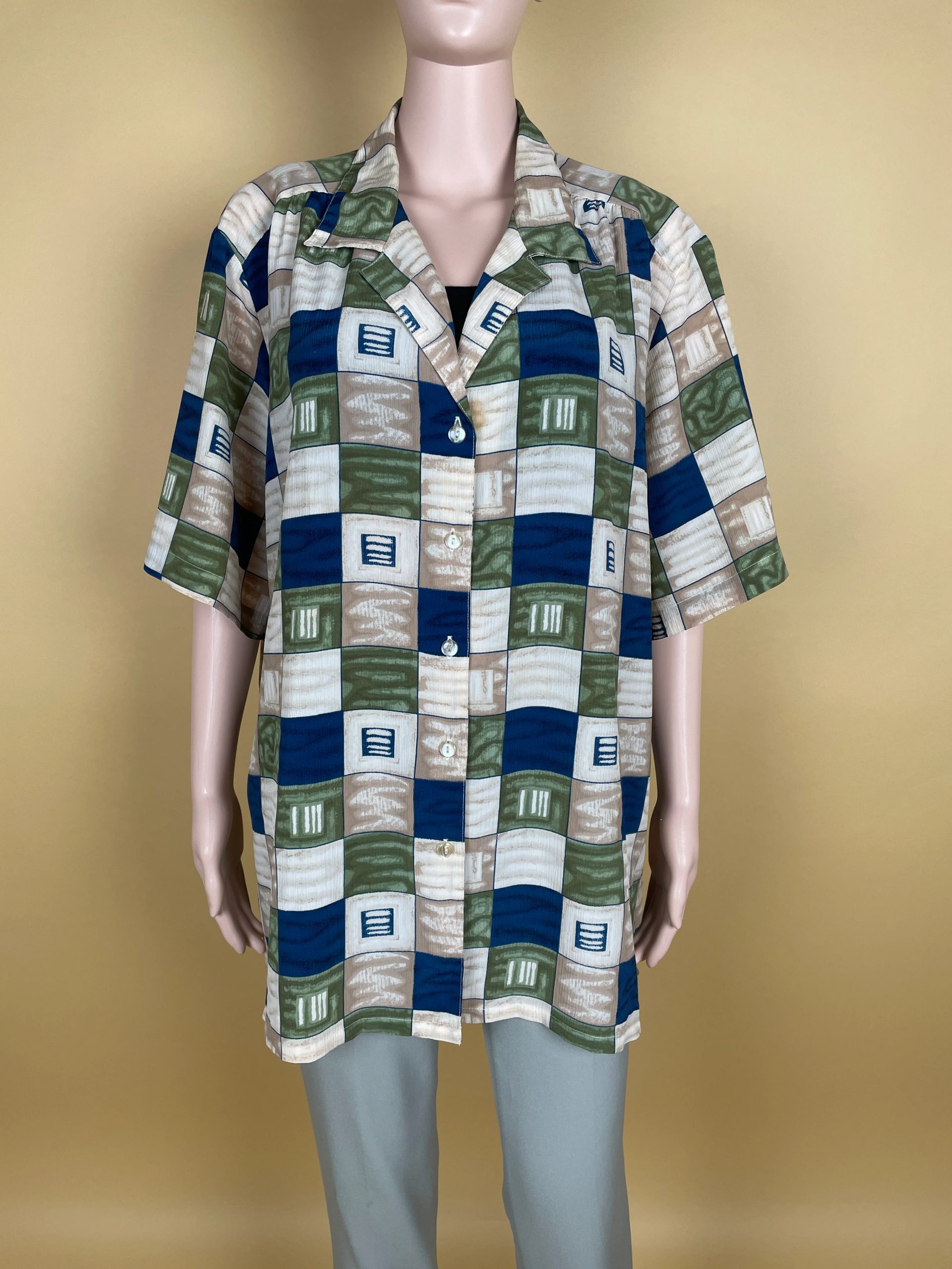 This trendy shirt features a vibrant and eye-catching geometric print, designed to add a unique touch to your casual wardrobe. The mix of green, blue, and beige tones creates a balanced, modern look, perfect for any laid-back outing or relaxed day. Its oversized fit ensures maximum comfort while maintaining a chic appearance.